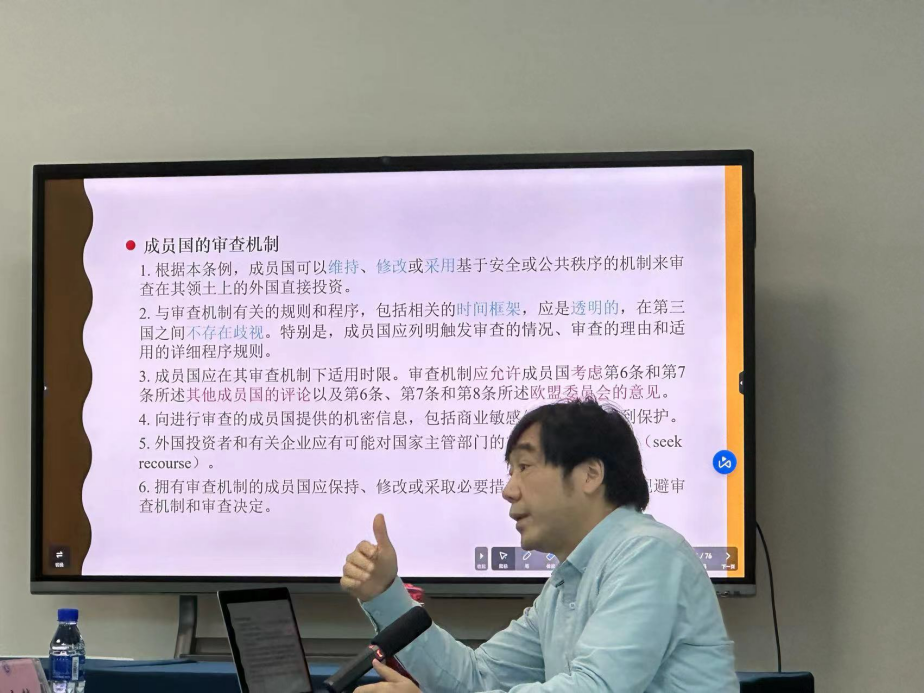 Professor Zhang Qinglin highlighted that the EU's foreign investment security review mechanism operates on a "dual-track" system, where the member state review serves as the primary channel for initial scrutiny, complemented by an auxiliary review conducted by the European Commission. He stressed that despite the formal implementation of the Regulation, the security and public order concerns related to the European Union's critical assets have grown more acute in light of significant global developments. In recent years, the EU has undertaken numerous initiatives to refine this mechanism, including broadening the scope of reviewable entities, harmonizing member state review processes, refining review criteria, increasing procedural transparency, and providing foreign investors with access to judicial remedies. Nevertheless, Professor Zhang noted that the current mechanism's institutional framework still exhibits notable deficiencies. Certain EU member states have yet to establish a comprehensive screening framework, leading to key foreign investments entering without adequate scrutiny, thereby exposing evident gaps in the system. This incisive analysis resonated deeply with the faculty and students present.