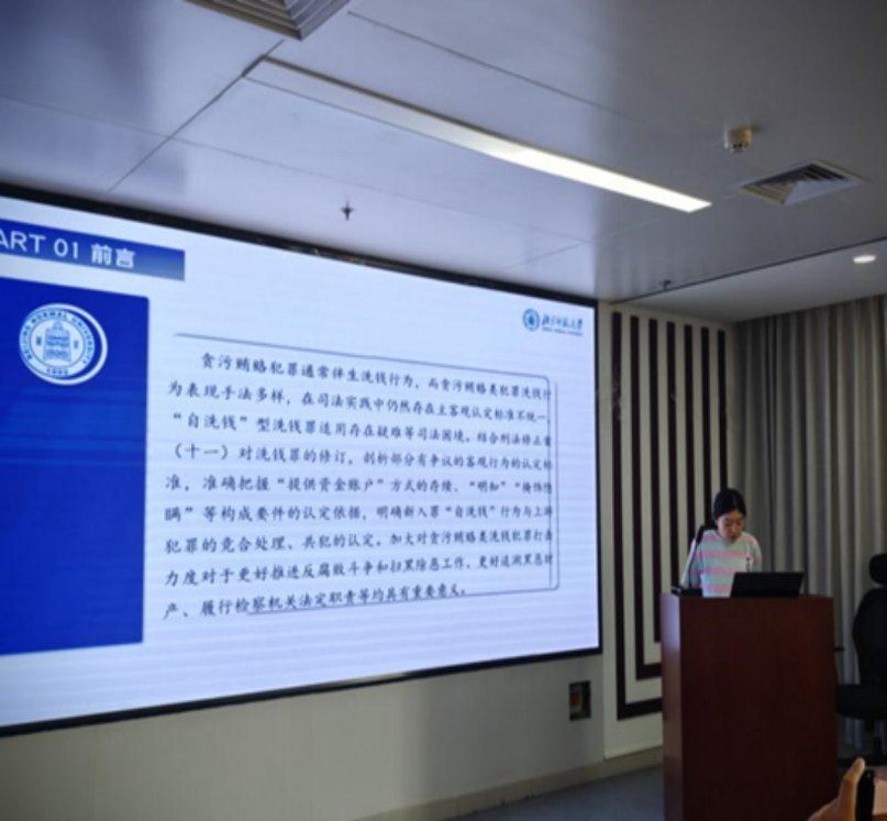 Zhou Xinmiao, a doctoral candidate at the Law School of Beijing Normal University, delivered a report entitled "Investigating Money Laundering Offenses in the Context of Corruption and Bribery." Zhou's paper posits that the primary challenges associated with money laundering crimes stemming from corruption and bribery revolve around the identification of the crime and the quantification of offenses. In the context of establishing the crime, within the framework of "providing a financial account," the perpetrator must engage in both "providing a financial account" and subsequent "transfer behavior" to be guilty of money laundering. The ascription of the perpetrator's subjective "knowledge" should encompass both "general awareness" and "definite knowledge." When determining the number of offenses, Zhou suggests adopting a case-by-case approach, guided by the principles of multiple offenses, constructive concurrency, and complicity in sentencing.