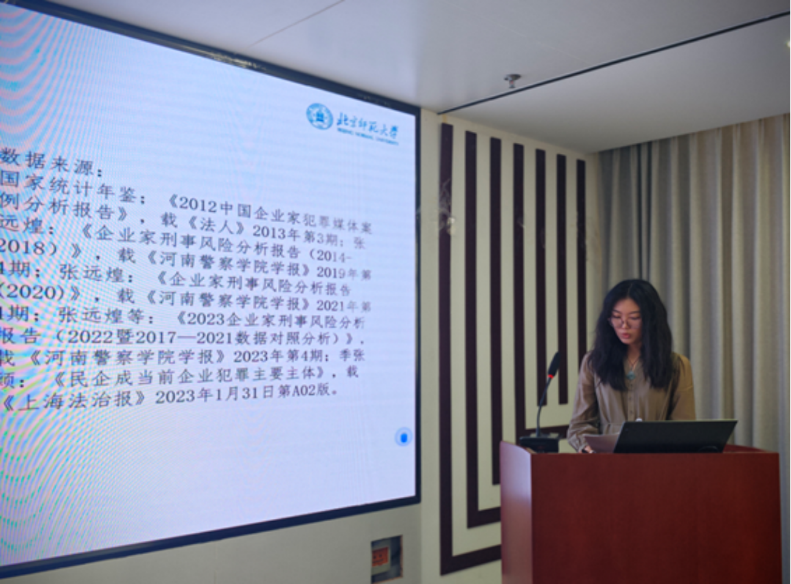 On June 20, the academic presentation of doctoral students in law of Beijing Normal University, titled "Special Seminar on the Criminal Law Amendment (XII)," was successfully held in Room 1822 of the Rear Main Building of Beijing Normal University, Haidian. This event was divided into two thematic sessions: "The Criminal Law Amendment (XII) and the Criminal Law’s Protection for Private Enterprises" and "The Criminal Law Amendment (XII) and the Prevention and Control of Corruption Crimes". Six doctoral students of the Class of 2023 from the Law School of Beijing Normal University reported on their research results on the theoretical and practical issues of the Criminal Law Amendment (XII). Associate Professor Shang Haowen and Teacher Li Di from the Law School of Beijing Normal University served as reviewers. At the same time, four doctoral students from the School of Law of Tsinghua University, the Law School of Renmin University of China and the Law School of Beijing Normal University were invited to parti as panelists. Each of the six presenters based their talks on fully developed academic papers, with each presentation lasting for 20 minutes. Following the completion of the presentations in each session, a series of panel discussions, open discussions, and commentary were conducted. The event spanned nearly four hours, during which each speaker delivered a comprehensive report derived from their respective paper. Both faculty members and panelists had meticulously reviewed the papers in advance and provided in-depth feedback and discussions based on the live presentations, culminating in constructive revision recommendations for the papers of the six speakers.
