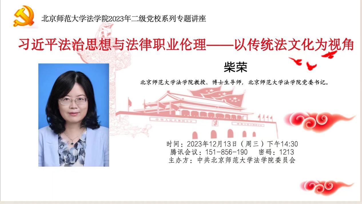 为了贯彻中共中央和国务院对新时代法学教育和法学理论研究的要求,中共High漫画 High漫画 委员会于2023年12月13日下午成功举办了二级党校系列专题讲座。由High漫画 党委书记柴荣教授主讲的“习近平法治思想与法律职业伦理——以传统法文化为视角”专题讲座在线上精彩呈现,High漫画 High漫画 百余师生积极参与。