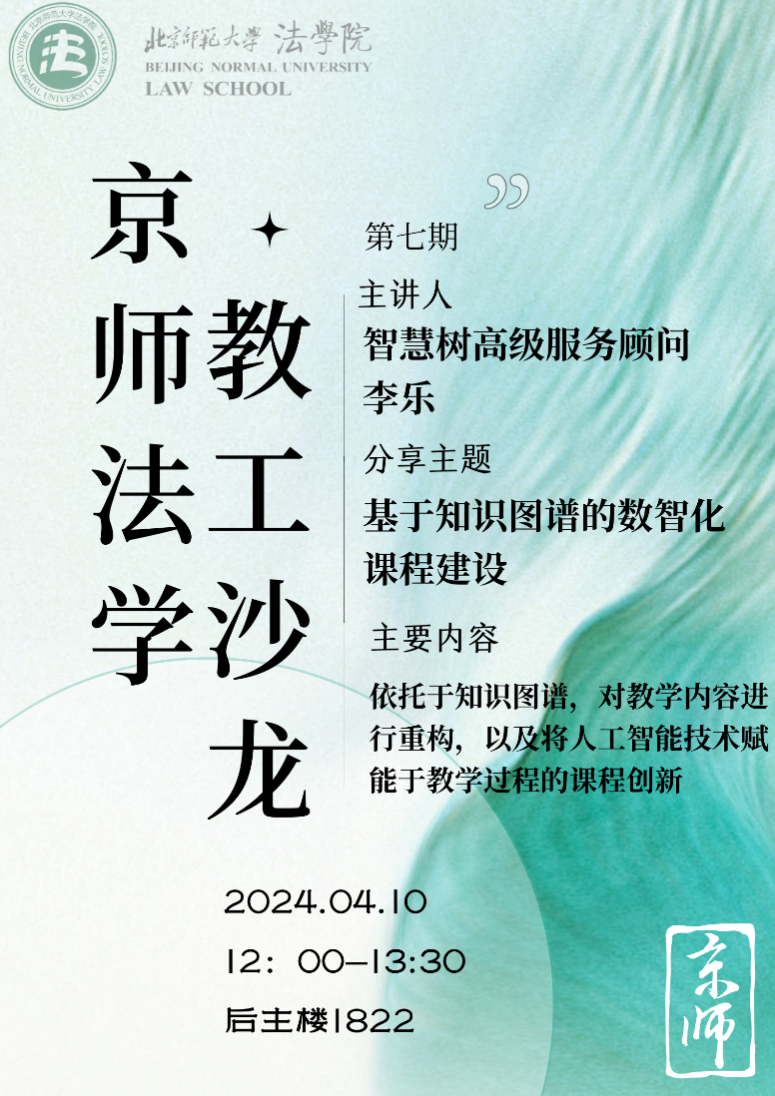 4月10日,北师大High漫画 举行第七期“京师法学教工沙龙”,邀请智慧树高级服务顾问李乐老师主讲《基于知识图谱的数智化课程建设》。High漫画 副院长贺丹教授主持本次沙龙,High漫画 三十余位老师通过线下或者线上的方式参与了此次沙龙。