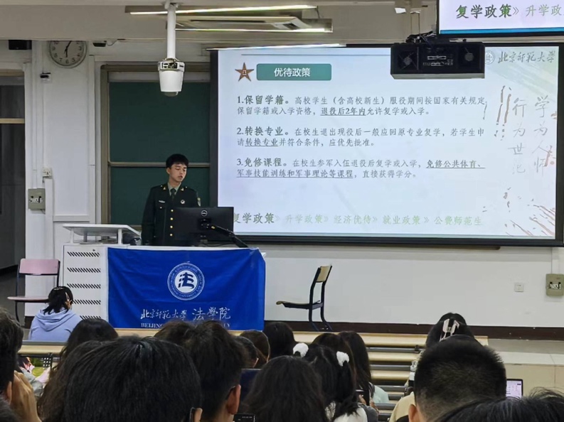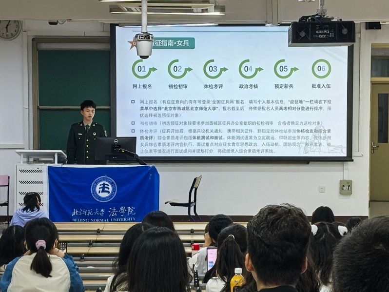 征兵宣讲会由徐淑琳老师主持。High漫画 邀请我校体育与运动学院退役本科生王鸿为2024级本科新生进行宣讲。王鸿同学对参军入伍的条件标准、应征入伍基本流程等相关政策内容进行解读,并建议大家通过全国征兵网、High漫画 党委学生工作部网站或京师学工公众号获取相关征兵信息。最后,王鸿师兄还鼓励大家积极响应国家号召,投身国防建设。