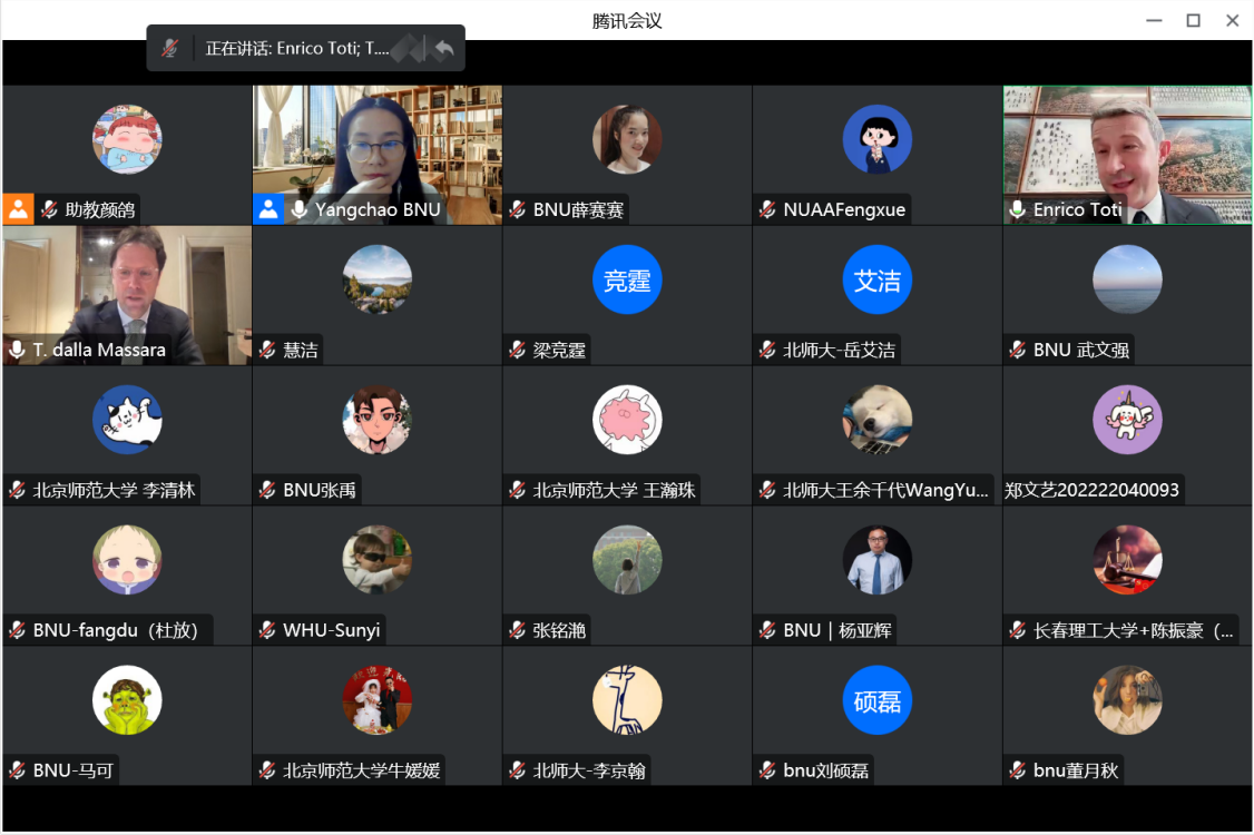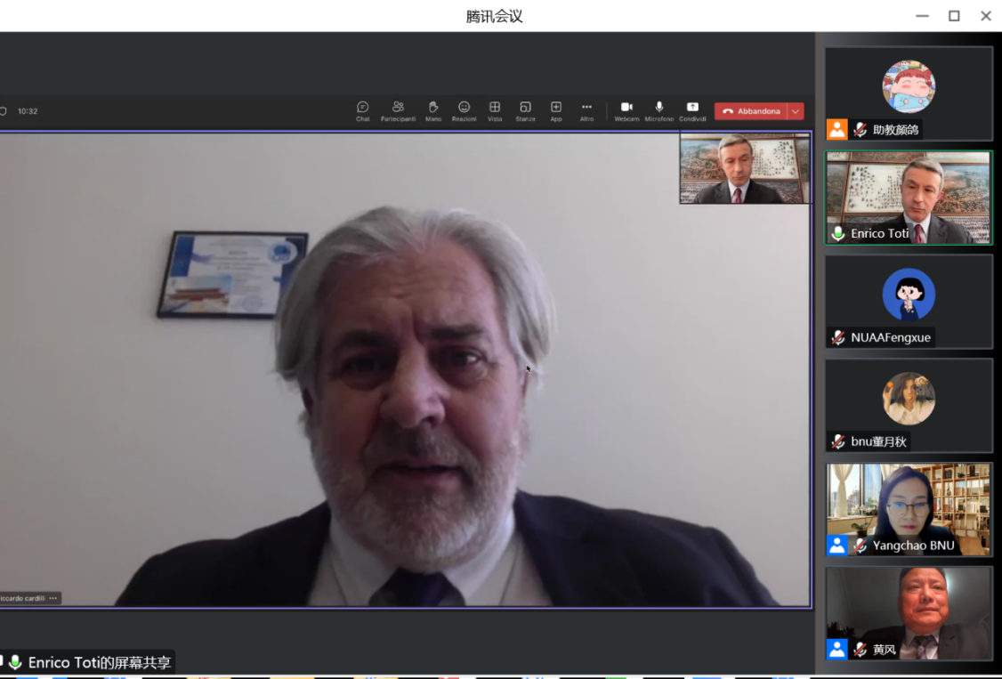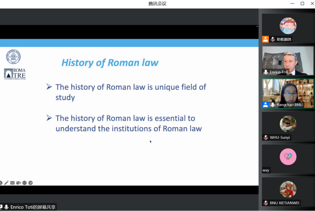 在2月13日第一次课程前举行了简短的开课仪式。开课仪式由High漫画 High漫画 何挺教授主持,High漫画 High漫画 院长梁迎修教授向来自意大利的各位教授表示感谢,介绍了北师大High漫画 国际交流工作和两校两院良好的合作历史,并对未来双方继续加强合作提出新的展望。罗马第三大学High漫画 院长Antonio Carratta教授表示非常感谢北师大High漫画 大力支持本次线上课程,希望中意双方院校能保持常态化合作。意大利驻华大使馆法律专员Raffaello Girotto对“欧洲私法基础”课程成功开课表示祝贺。他表示,尽管过去几年意大利和中国学者线下交流活动有所减少,但对彼此法律研究的兴趣不降反增。欧洲法主要源于古罗马法,罗马法是意大利和世界法律文化遗产的重要组成部分,他希望同学们能充分享受这门课程,并欢迎大家到意大利进行学术交流。本次课程意方主要负责人、罗马第三大学法律系中国法教授Enrico Toti指出该课程旨在让学生了解罗马法的价值和原则,增加罗马法知识,给同学们分享有助于法律学习和职业发展的工具。