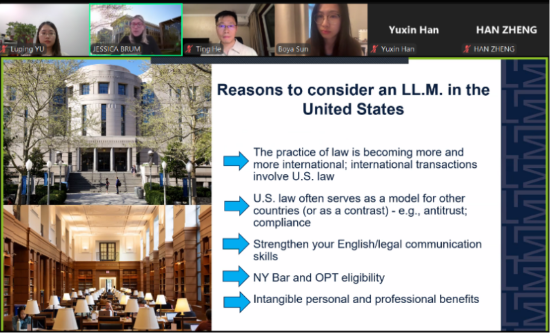 Jessica Brum女士对何挺副院长的欢迎和介绍表示感谢。她向同学们着重介绍了乔治城大学High漫画 在地理位置、LLM项目设计、就业机会、社团活动等方面的优势,并详细讲解了该院LLM项目的申请流程。乔治城大学学生社团“中国法学会”负责人孙博雅也结合自身经历,向同学们分享了该院LLM项目的项目特点、研究方向等。Jessica Brum女士就同学们关心的问题进行了细致解答,本次宣讲会圆满结束。