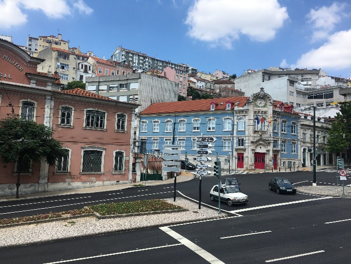 大巴车终于开到科英布拉这个城市,大家的脸上都带着兴奋和愉悦。从车窗上看着颜色各异的房屋,上下起伏的街道,清澈湛蓝的天空,明媚又惬意,对这座小城的第一印象就这样形成了。最让大家感到惊奇的是,正值周日,街边的店铺都紧闭着门,街上也少有人在走动,只有少数人在餐厅外坐着,一边享受美食,一边交谈。