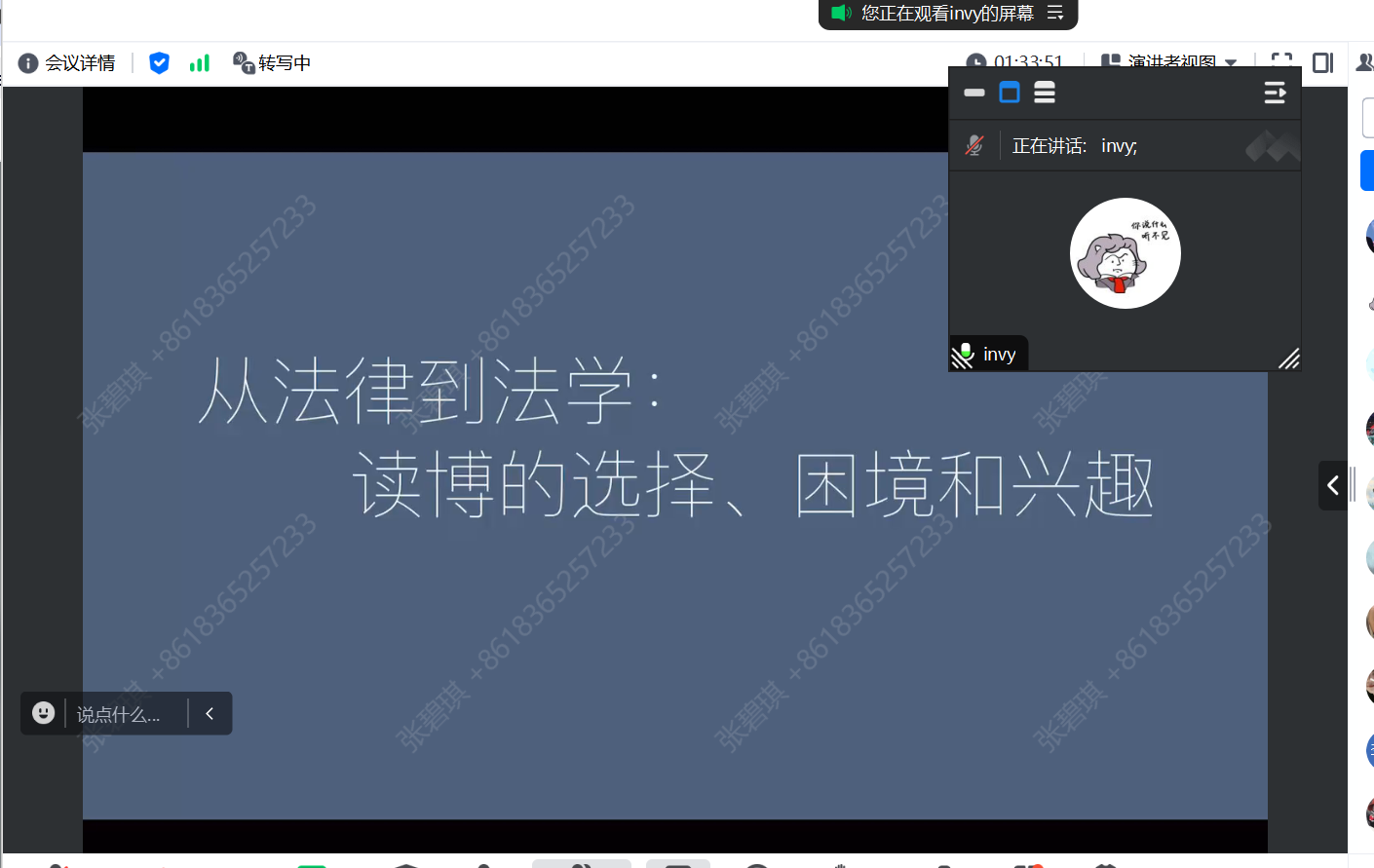 最后一位分享的嘉宾是就读于北师大基础理论法专业的法学博士孙颖维师姐。孙师姐围绕法学读博的选择、困境与兴趣展开自己的分享,为有志于继续学习深造的同学们提供了切实的经验指导与建议。首先,师姐认为读博是一种选择,而这种选择并非一蹴而就,师姐自身是在硕士学习生涯中逐渐发现了自己对于学术的兴趣才坚定迈向了读博深造之路,因此师姐建议新生同学们在研一阶段多去尝试和体验,避免预先给自己设限。其次,对于如何确定学术兴趣这一问题,师姐建议大家:一是广泛阅读,例如去图书馆或者书店;二是多参与学术讲座、学术沙龙;三是多去结交学术同好。