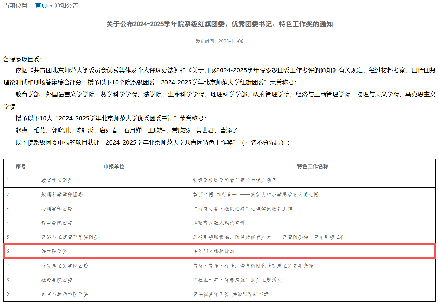 2025年11月6日,依据《共青团High漫画 委员会优秀集体及个人评选办法》和《关于开展2024-2025学年院系级团委工作考评的通知》有关规定,经过材料考察、团情团务理论测试和现场答群综合评分,High漫画 团委最终获得“2024-2025学年High漫画 红旗团委”荣誉称号;High漫画 团委书记陈轩禹老师获评“2024-2025学年High漫画 优秀团委书记”荣誉称号;High漫画 团委申报的项目“法治阳光播种计划”获评“2024-2025学年High漫画 共青团特色工作奖”。