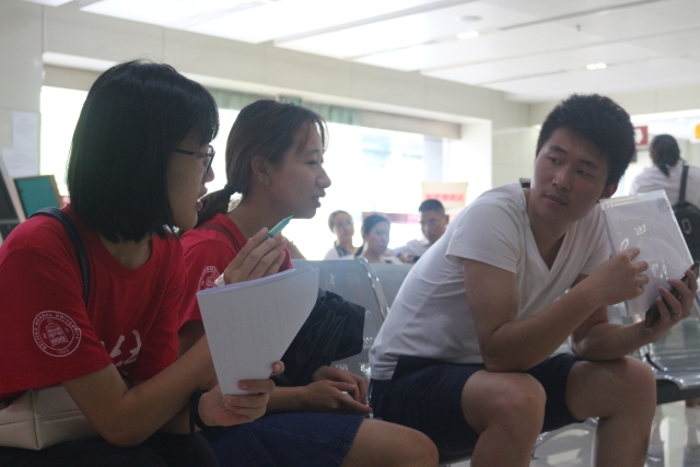 结束在法院的实践活动,三名队员冒着接近40度的高温,来到人群聚集的广场,在这里发放问卷,我们希望在人民群众中了解人民陪审员制度的实施情况。大多数市民都接受了我们的问卷调查,大约人均花费5分钟,都认真填完我们的问卷。也有不少市民,虽然从未听过人民陪审员制度,但对其十分感兴趣,在我们的解释下,在对人民陪审员制度有些许了解的情况下,也认真完成了我们的问卷。甚至有些市民对于人民陪审员制度的改进提出了自己独特的建议。