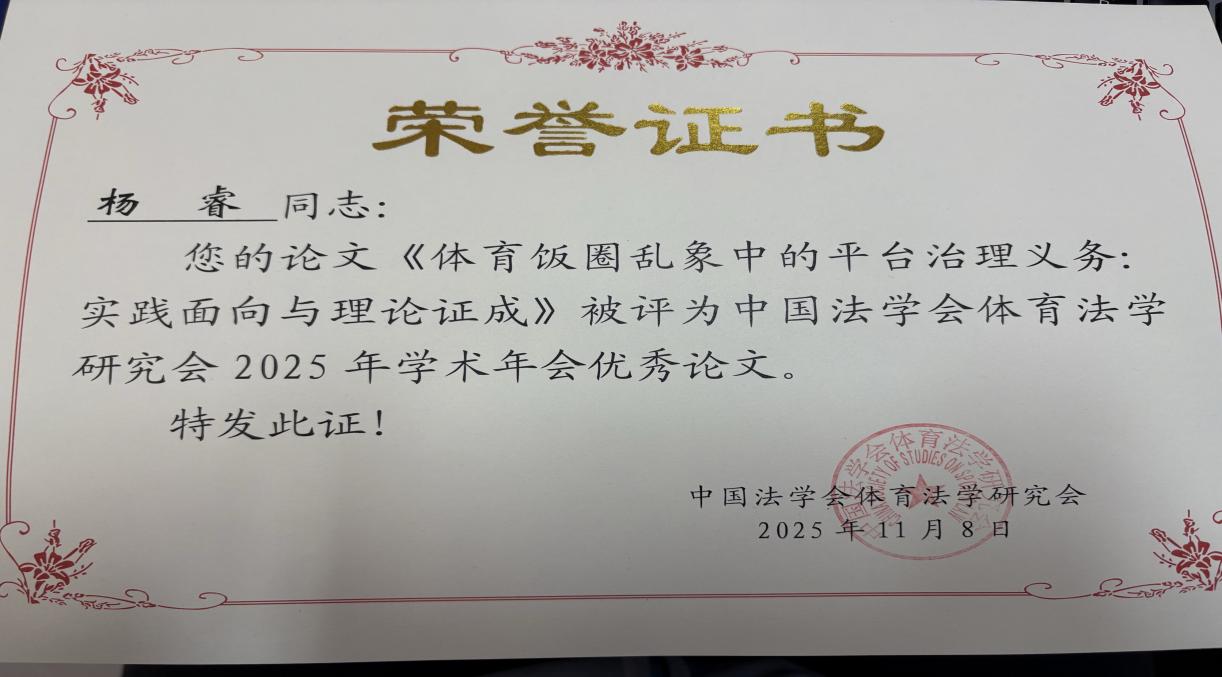 High漫画 High漫画 2024级博士研究生杨睿受邀参加了本次年会。其撰写的论文《体育饭圈乱象中的平台治理义务:实践面向与理论证成》获评年会“优秀论文”。会议期间,杨睿在分论坛就该选题进行了学术汇报。