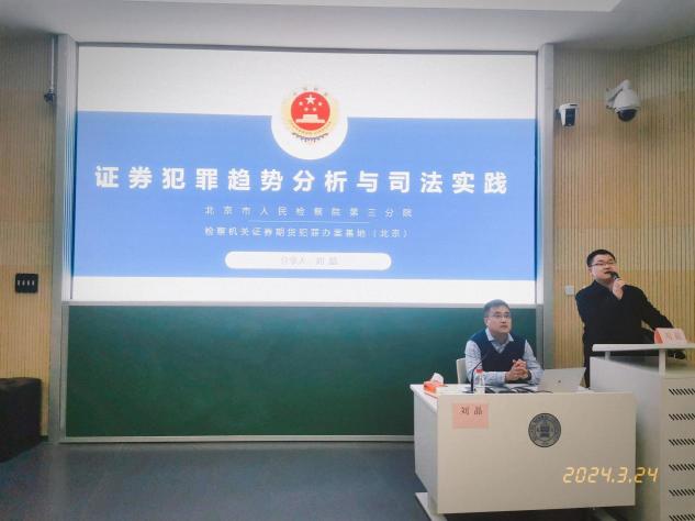在讲授部分,刘晶检察官首先从证券市场结构、资本市场形成、信息披露制度以及注册制改革等方面向同学们介绍了我国证券期货市场的发展状况,并从司法实践中常发的证券犯罪类型、行刑衔接机制、检察机关管辖证券期货犯罪案件的职能履行、犯罪发展的趋势分析等方面说明了我国当前证券期货犯罪的整体态势及刑事规制状况。接下来,刘晶检察官针对证券犯罪中的主要类案司法实践问题,以内幕交易、泄露内幕信息罪、利用未公开信息交易罪、欺诈发行证券罪等罪名为例,从构成要件解释及办案标准分析的角度为同学们进行了详细阐释。针对“异常交易认定”、“被动获悉认定”、“接触联络的证明程度”等多个司法实践中常发的争议较大的问题,刘晶检察官借助刑事审判参考、两高一部证监会联合发布等渠道公开的典型案例,从刑法理论与实务认定的角度出发对裁判要旨进行了详细解读,阐明了检察机关在处理争议问题时的做法以及法理依据。