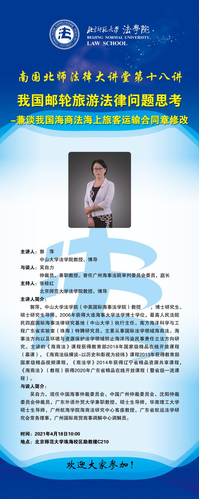 【04.18】南国北师法律大讲堂第十八讲—我国邮轮旅游法律问题思考兼谈我国海商法海上旅客运输合同章修改/主讲人:郭萍