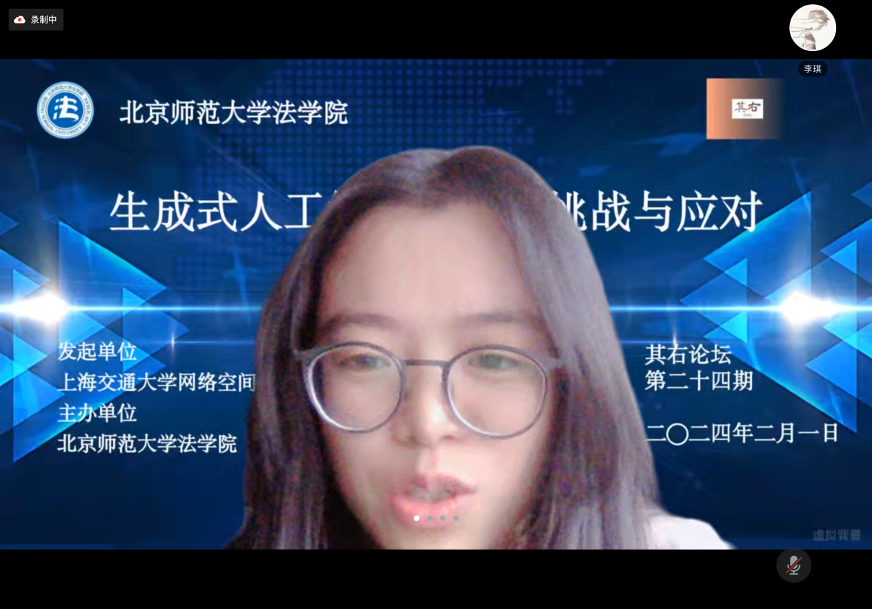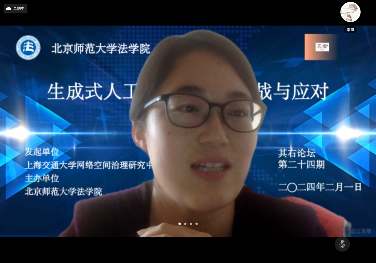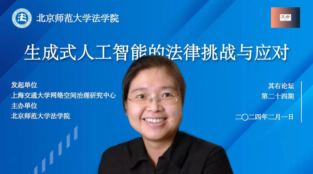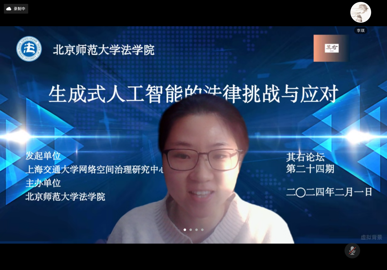 其右论坛第二十四期网会于2024年2月1日顺利召开。本期论坛的主题是“生成式人工智能的法律挑战与应对”。来自多所高校的60余名师生参与了本期论坛。
