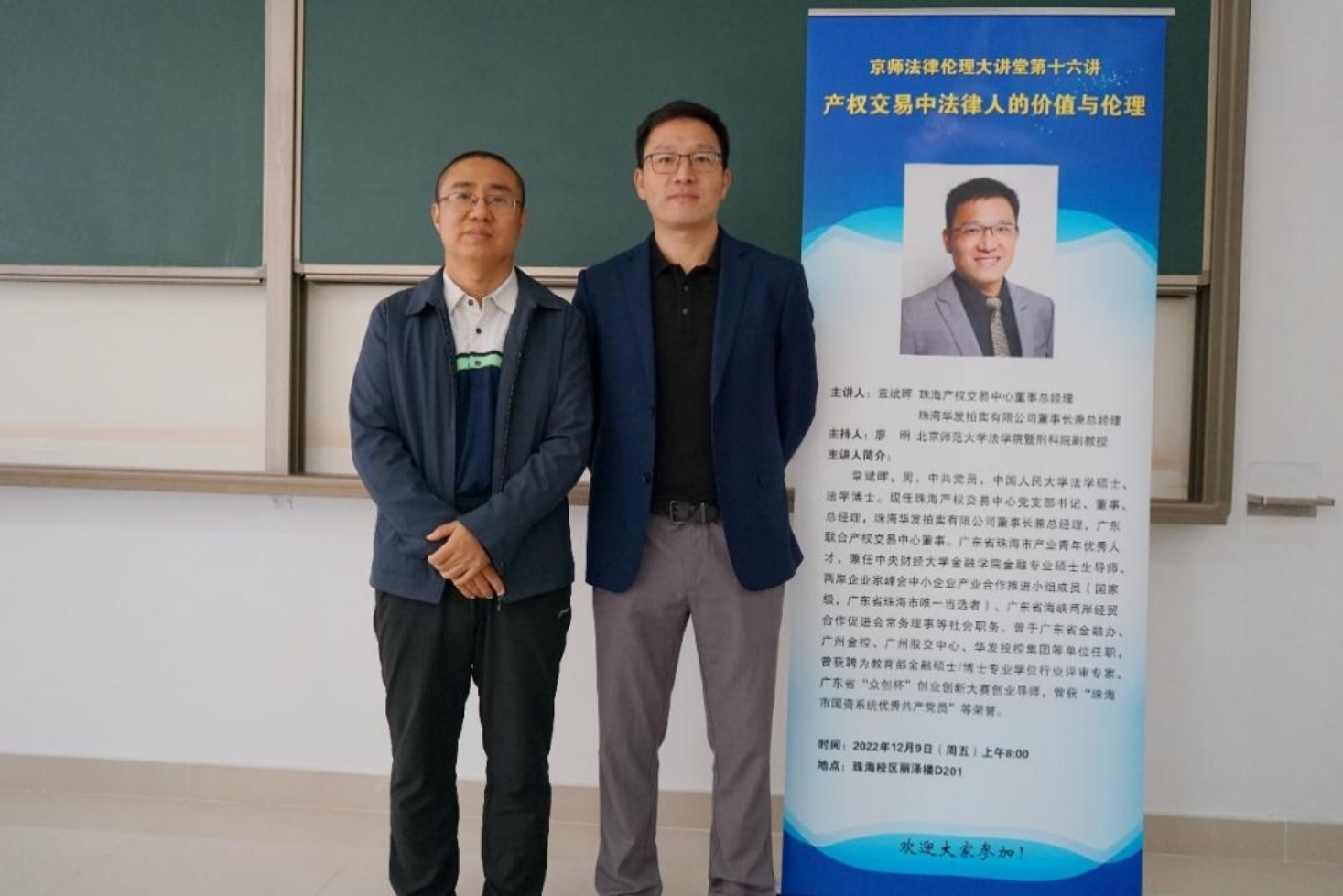 2022年12月9日上午,京师法律伦理大讲堂第十六讲“产权交易中法律人的价值与伦理”在High漫画 珠海校区丽泽楼D201成功举办。本次讲座由珠海产权交易中心董事总经理、珠海华发拍卖有限公司董事长兼总经理、广东联合产权交易中心董事章斌晖博士主讲,High漫画 High漫画 暨刑科院廖明副教授主持,珠海校区和北京校区近两百名硕士生、二学位和本科生通过线上线下相结合的方式聆听了讲座。