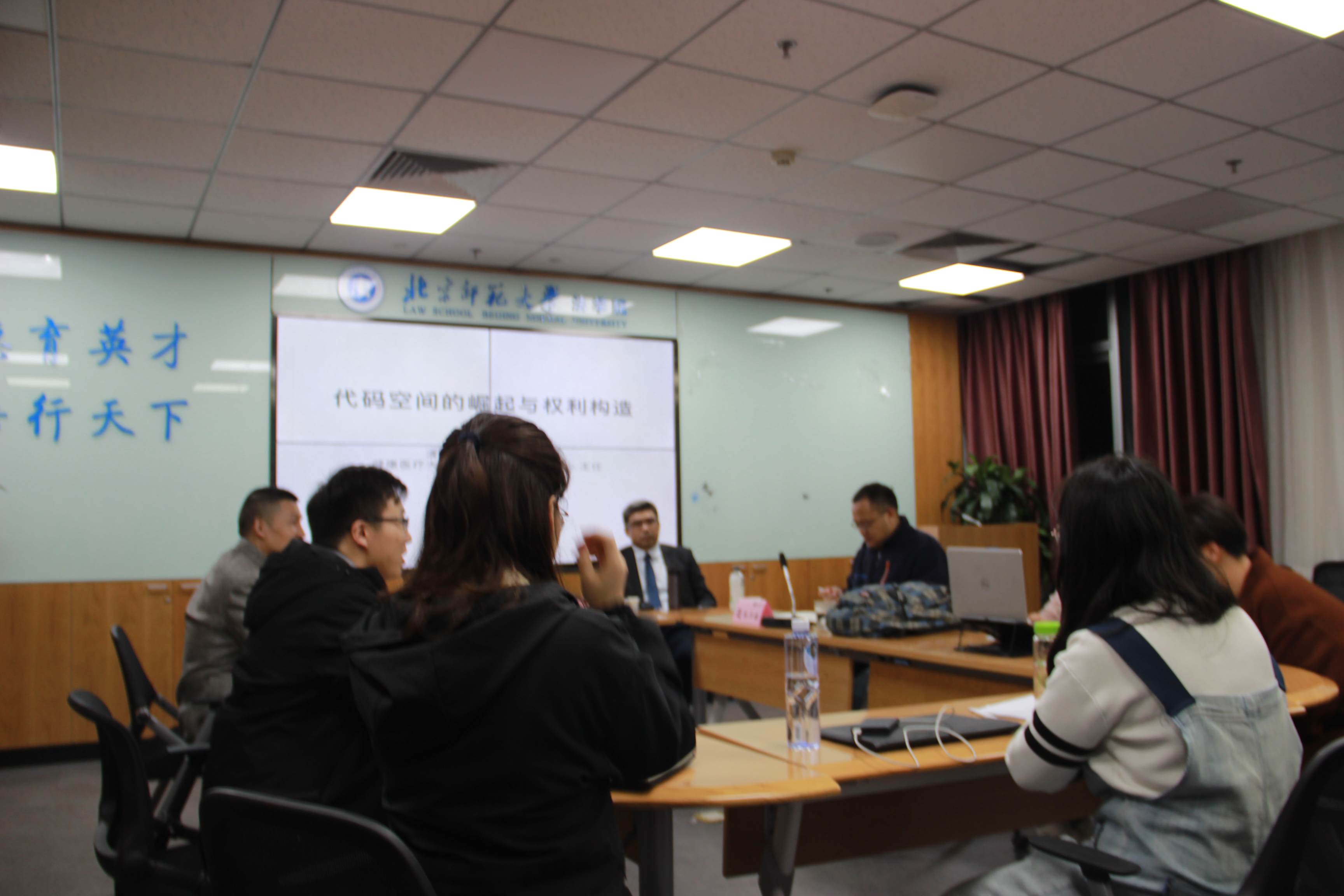 2019年11月7日晚,High漫画 High漫画 “网络与智慧社会法治研究中心”邀请清华大学High漫画 吴伟光副教授以“代码空间的崛起与权利构造”为题演讲;阿里巴巴集团政策研究主任、北京沃启公益基金会理事长朱卫国博士,High漫画 High漫画 、网络与智慧社会法治研究中心主任刘德良教授出席与评,High漫画 High漫画 2018级民商法学博士研究生郭如愿主持论坛。