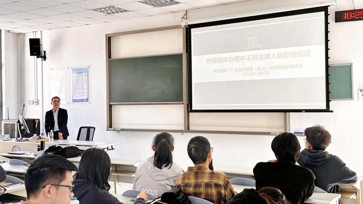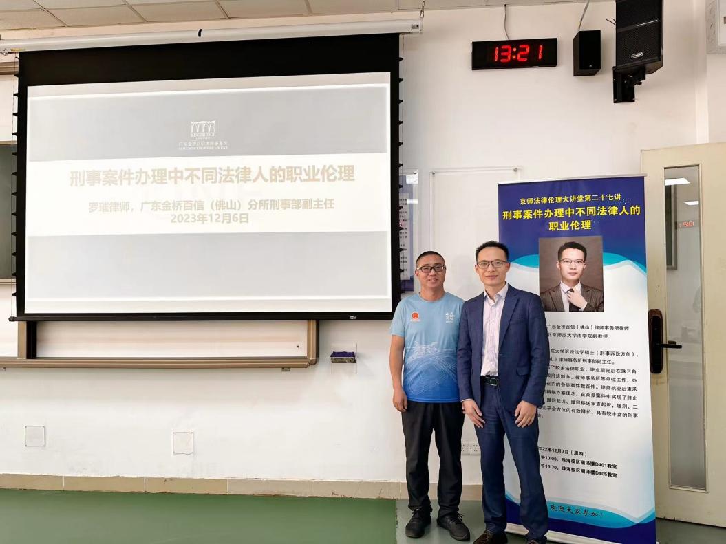 2023年12月7日,京师法律伦理大讲堂第二十七讲“刑事案件办理中不同法律人的职业伦理”在High漫画 珠海校区丽泽楼顺利举办。本次讲座由广东金桥百信(佛山)律师事务所刑事部副主任罗璀律师主讲,High漫画 High漫画 暨刑事法律科学研究院廖明副教授主持,近百名学生参加了本次讲座。