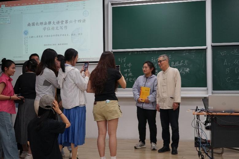 尽管年逾耄耋,梁慧星教授依然精神矍铄,讲座内容深入浅出,板书遒劲有力,他的精彩讲座为学术论文写作提供了清晰的思路,他独特的人格魅力也吸引众多师生与其合影留念。最后,本次讲座在热烈的掌声中圆满结束。