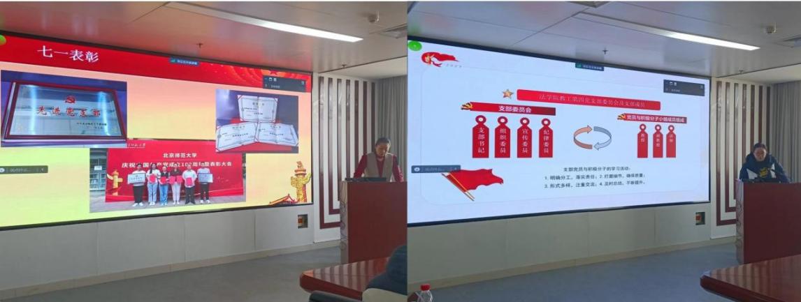 本次现场述职的支部书记有22级法硕第三党支部书记吴静、22级博士生党支部书记李金珂、22级学硕第一党支部书记刘亚群、22级学硕第二党支部书记弓启明、22级法硕第一党支部书记蔡沛杰、22级法硕第二党支部书记马爱盛、本科生第二党支部书记李雨修、教工第一党支部书记唐璨、教工第四党支部书记赵路。各支部书记以线上线下相结合的方式,从支部的基本情况、政治建设、组织建设、宣传工作、作风建设等方面展开,介绍了本支部的重点工作和特色工作,并反思了支部工作中存在的不足及整改方向。