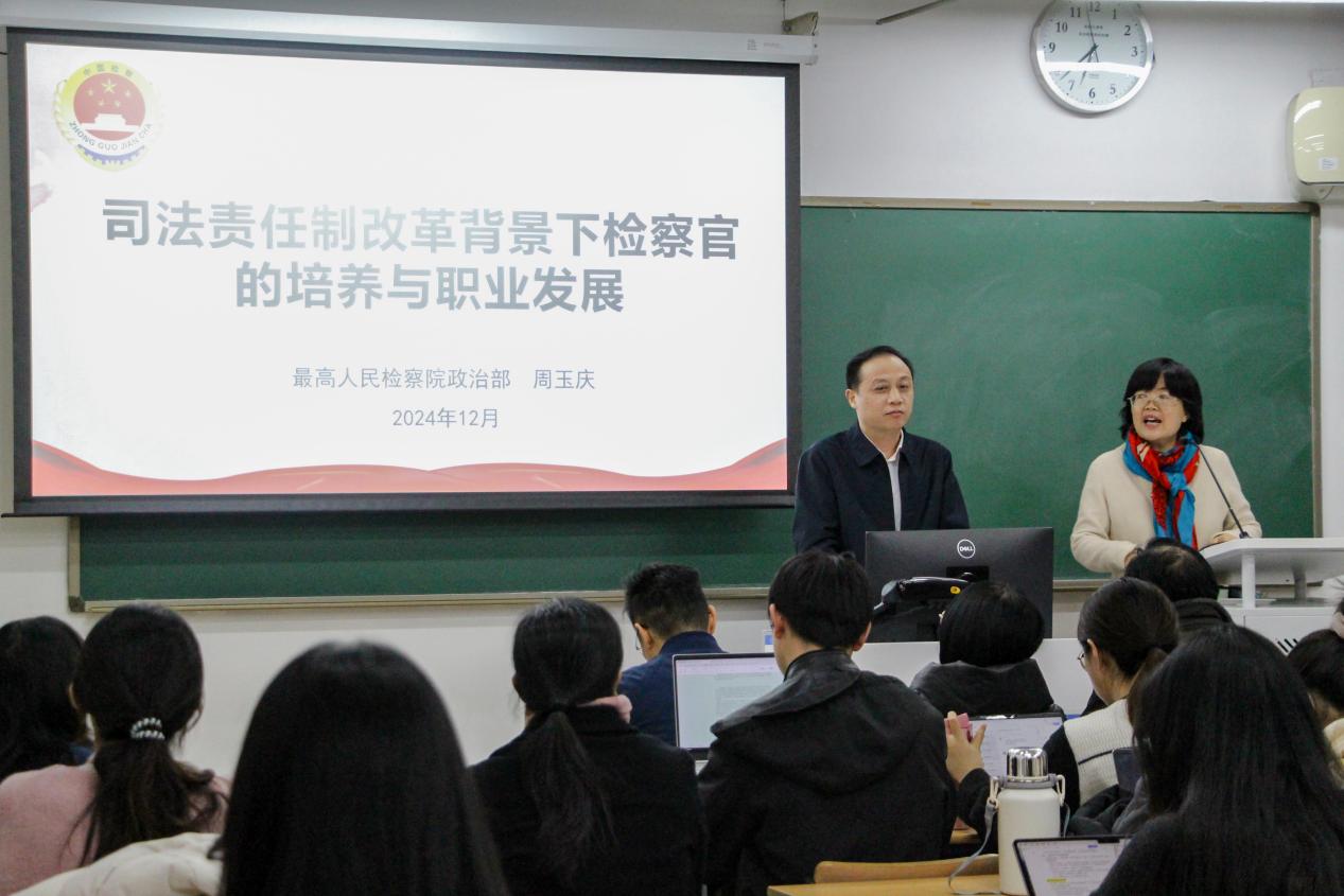 周玉庆副主任说,深入推进司法责任制改革,是党的十八大以来以习近平同志为核心的党中央坚持全面依法治国,顺应现代法治发展需要,更好满足让人民群众在每一个司法案件中感受到公平正义的重大举措,有力地提高了司法质效、促进了司法公正。对于现阶段检察官“如何养”,周主任谈到,司法责任制改革背景下,检察机关用好“红、专、实、尖、外”五字诀,通过政治素质培训“政培”、专业能力培养“专培”、实践能力锻炼“锻培”、精英人才培养“精培”、涉外法治人才培养“外培”等五条路径,持续锻造高素质专业化检察官队伍。对于检察官职业发展“走向哪”,周主任结合检察官入额、检察官等级、职级晋升等有关规定,谈到进入检察院工作,可以入额成为检察官、成长为检察机关领导人员、成为党政机关领导干部、成为检察业务专家、成为涉外检察官、成为检察英雄模范等六条发展路径,为在场师生讲清了检察官的职业发展方向。对于大学生适应职场“怎么办”,周主任结合丰富的工作经历谈到,考试是让组织发现的重要途径,要不断提高自身综合素质,做好准备考;不干,半点马克思主义都没有,要摒弃自我、重利、怕责、躺平的错误倾向,不谈条件干;文字能力是体制内职场的核心竞争力,要不厌其烦写,通过“模仿、模糊、模范、模型”的四个阶段使自身的写作能力得到质的飞跃;要保持良好心态乐,努力成为有胸怀、有情怀、有身怀、能开怀的新时代好青年;廉洁自律是职业发展的前提和基础,要严格自律守住底线,时刻注重通过自我革命完善自身,把理念转化为信念、将情绪转化为情怀、把牢骚转化为“离骚”、将抱怨转化为抱负。